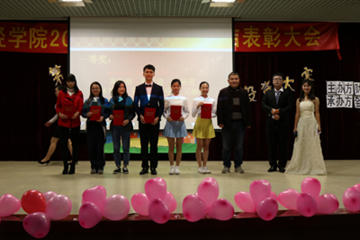最后进行的是2015年全国高校商业精英挑战赛国际贸易竞赛总结表彰,首先,主持人介绍了国赛获奖情况,宣布公司斩获全国总决赛二等奖及最佳院校组织奖,参赛选手重现赛场风资,以欢乐的开场表演,流畅的英语演讲,多媒体展示把现场气氛再次带入高潮,现场掌声雷动。接着主持人公布了校内复赛奖项,颁奖嘉宾张建龙、倪江崴、谭飞、张志红分别为优秀奖的七队,三等奖的三队,一等奖的二队,一等奖的一队颁发奖项,尾声国贸大赛指导老师吴霜上台进行了激情洋溢的讲话,鼓励同学们积极参加学科竞赛。