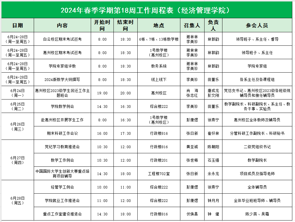 2024年春季学期第18周工作周程表