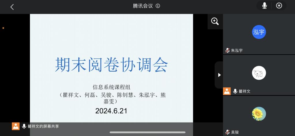 (通讯员:瞿祥文)2024年6月21日,随着夏季学期的尾声渐近,信息系统课程组于晚上19点召开了一场期末阅卷协调会,确保阅卷公平与高效。本次会议旨在统一阅卷标准,确保考试公平、公正,同时优化阅卷流程,提高阅卷效率。全组老师悉数出席,共同探讨并落实期末阅卷工作的各项细节。