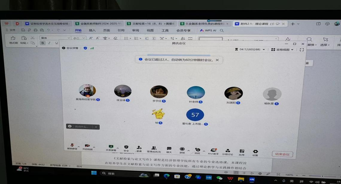 (通讯员:莫海燕)投资理财课程组于6月24日下午19:00在腾讯会议平台上召开了关于2024新版教学大纲的撰写及期末各项工作讨论会。本次会议由课程组组长莫海燕老师主持,倪江崴副经理、董化春、 陈琸等投资理财类课程组全体老师参加了此次会议。