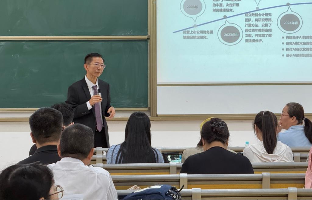 分享会上,朱文教授深入阐述了团队在民营上市公司财务困境研究方面取得的突破性成果。2008年,受新兴技术启发,团队开启财务健康研究之旅,历经多年深耕,于2023年组建数智会计研究团队全力推进研究工作。至2023年底,两篇精心打磨的论文经三轮修改后成功投稿SCI并顺利发表。步入2024年,团队成果进一步涌现,发布了中国主板上市公司财务健康“华商”蓝皮书,在AI与财务融合的多个关键研究方向,如构建AI财务健康评估模型、探索AI在财务预警及决策优化中的应用、创新财务数据分析方法等,均取得了重要进展。