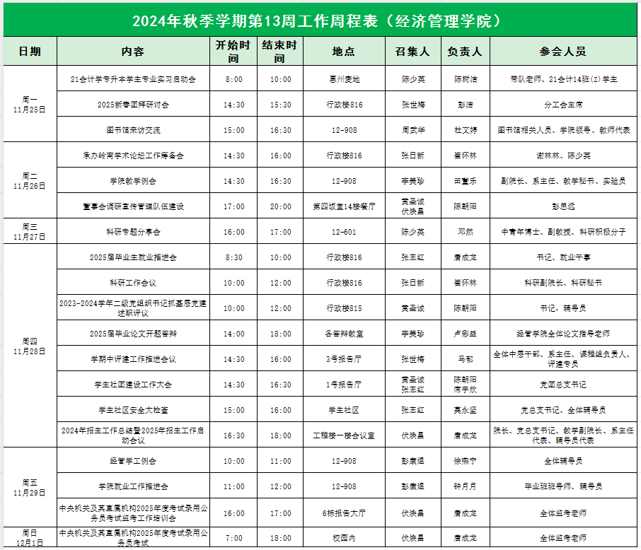 2024年秋季学期第13周工作周程表