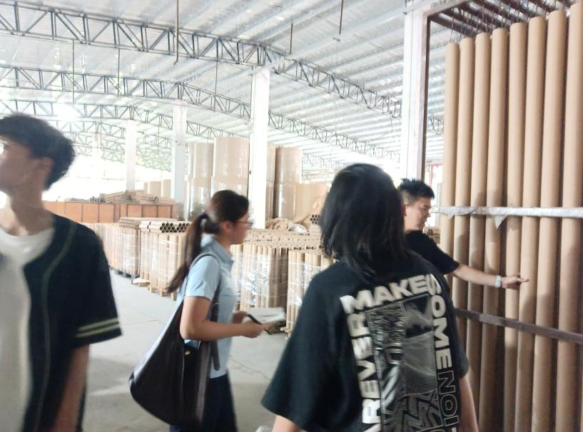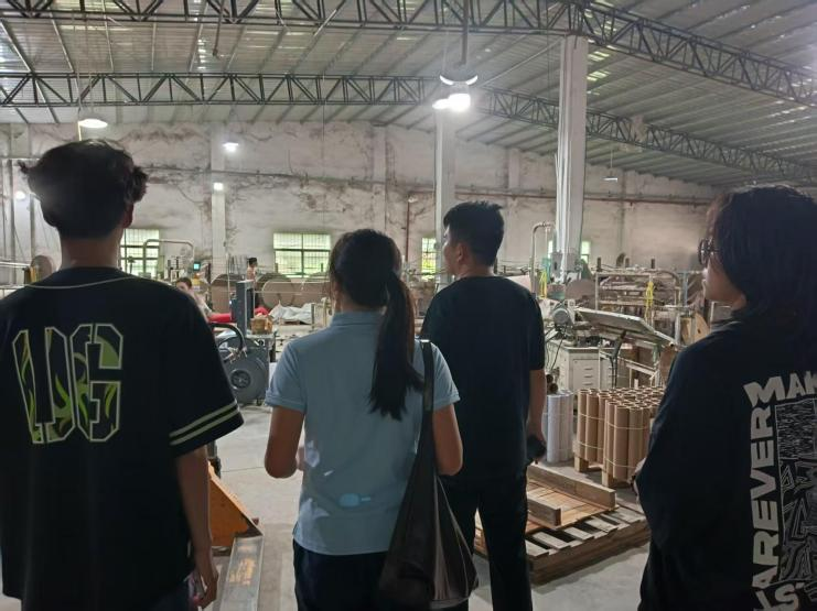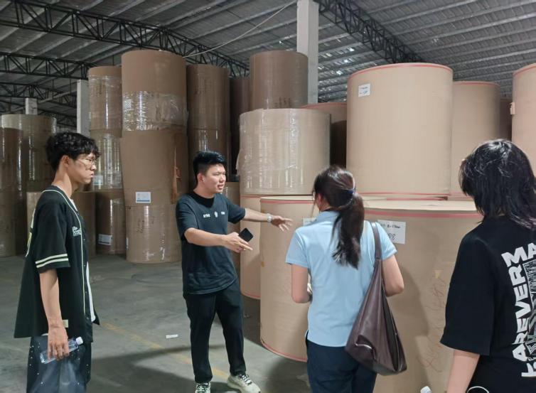 调研过程中,叶赛老师结合现场设备与生产情况,为同学们全方位讲解纸筒生产的全流程。同学们一边聆听叶赛老师细致的讲解,一边认真观察生产线上的每个环节,对生产过程中的细节充满好奇。他们对此进行深入思考并提出问题,与老师展开热烈探讨。