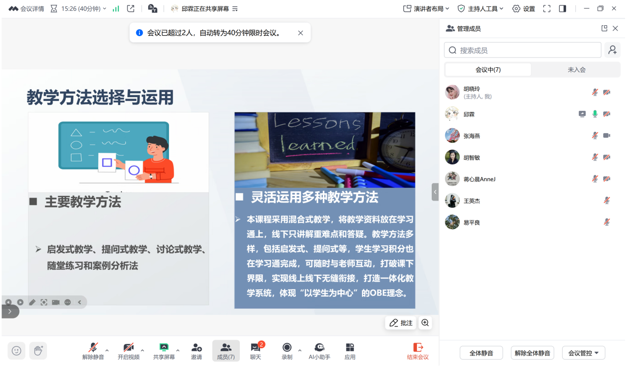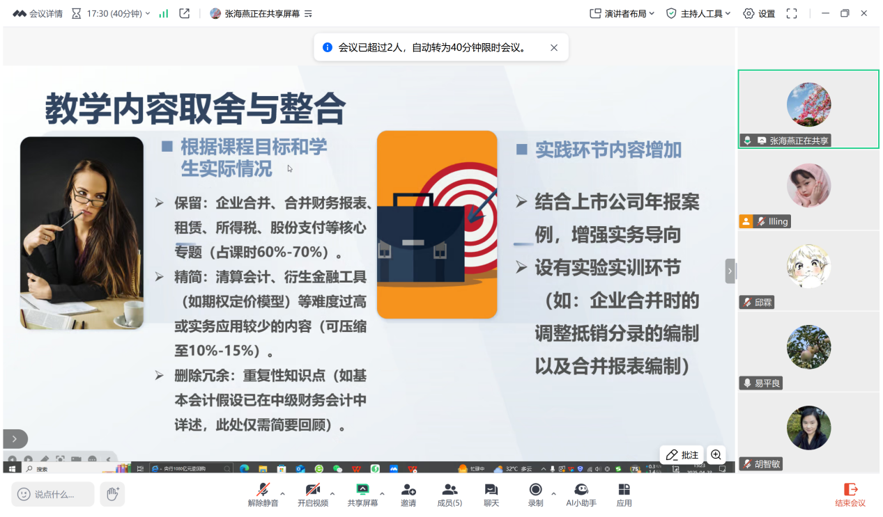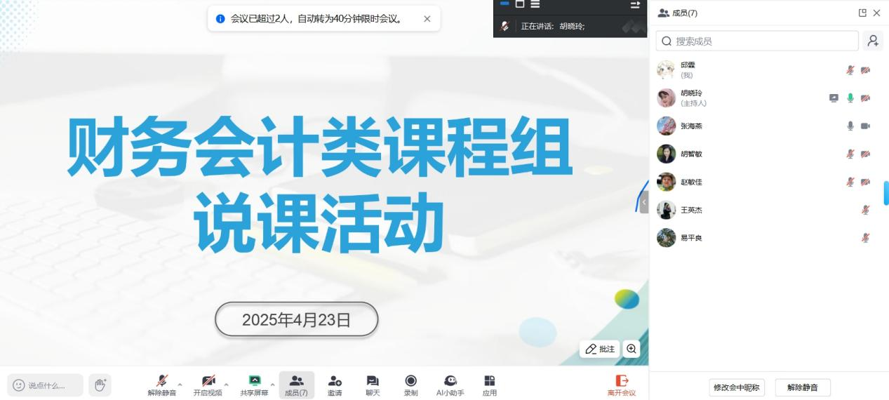 (通讯员:胡晓玲)2025年4月23日下午,为贯彻落实本科教学合格评估体系要求,依据《bevictor伟德官网“五说”演练活动方案》,财务会计类课程组在腾讯会议平台开展说课活动。本次活动由课程组组长胡晓玲老师主持,课程组成员共同参会。