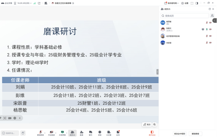 会议首先就教学大纲修订展开研讨,课程负责人彭维老师详细讲解了教学大纲的修改要点,包括突出课程思政元素、融入数字经济相关案例、优化章节设置等。张雅文组长进一步明确了课程组在大纲修订中的具体分工与责任。