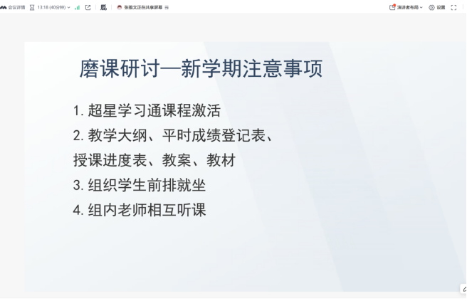 针对新学期教学工作,会议提出多项注意事项:要求及时激活超星学习通课程,确保线上教学资源的有效利用;统一教学大纲、平时成绩登记表、授课进度表、教案及教材等教学文件;推行员工前排就坐制度,以提升课堂互动效果;鼓励组内老师相互听课,促进教学经验交流。