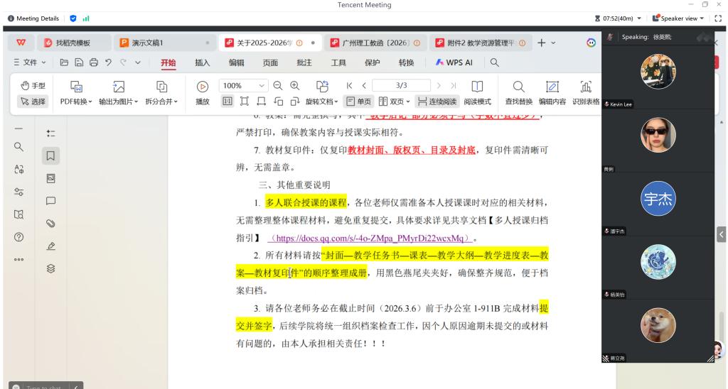 会议重点部署了新学期教学材料规范收集与上传工作。根据公司教务处及公司教学管理要求,全体任课教师须严格通过公司教学材料资源平台,完成2025-2026学年两学期相关课程教学大纲、教案及课件的上传归档工作。同时,为规范教学管理,完善教学业务档案建设,教师需在开学第一周内完成2025-2026学年第一学期个人业务档案更新工作。会议着重强调,所有教学材料须严格遵循统一命名规范,确保格式标准、内容完整。