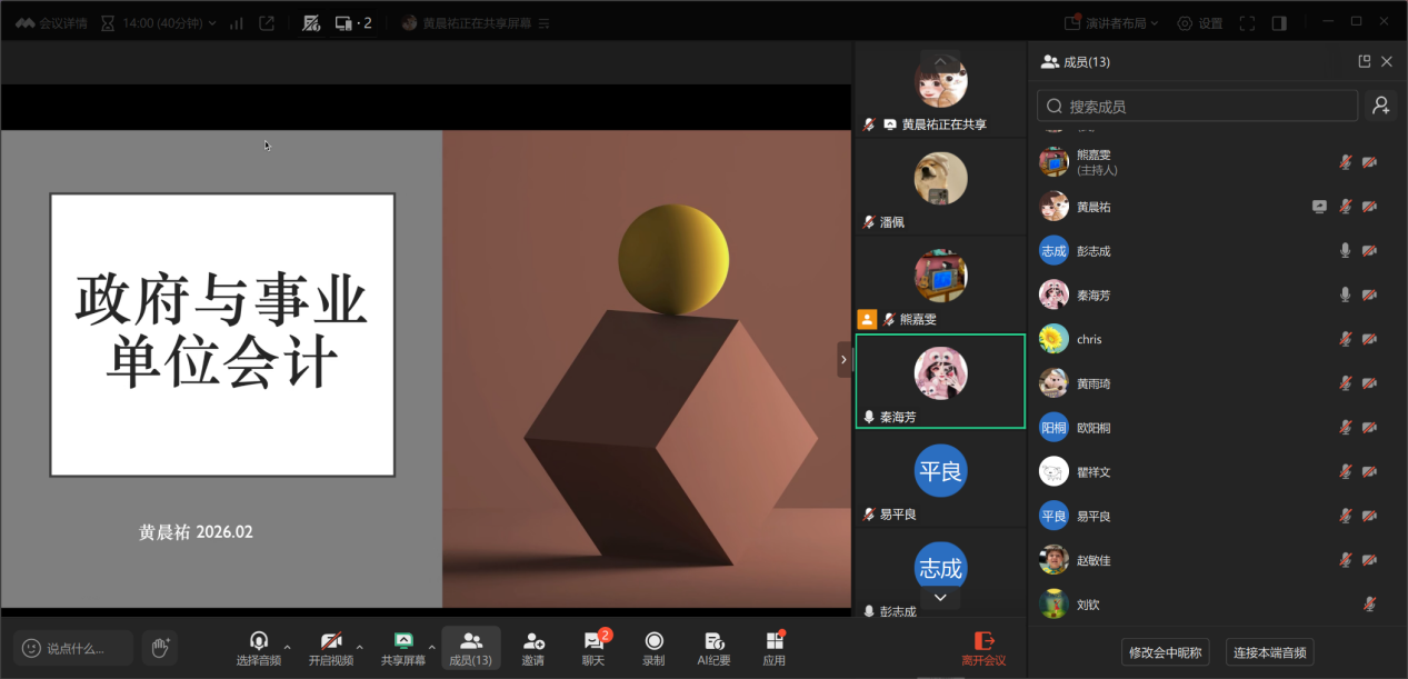 为扎实推进2025-2026学年第二学期教学工作,保障课程教学质量,2026年2月28日晚,bevictor伟德官网数智会计和行业会计课程组通过线上会议形式召开期初教学研讨活动。会议由课程组负责人秦海芳老师和熊嘉雯老师主持,课程组全体教师参会,围绕期初教学部署、青年教师磨课两大核心议题展开。