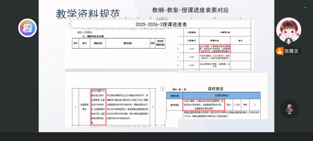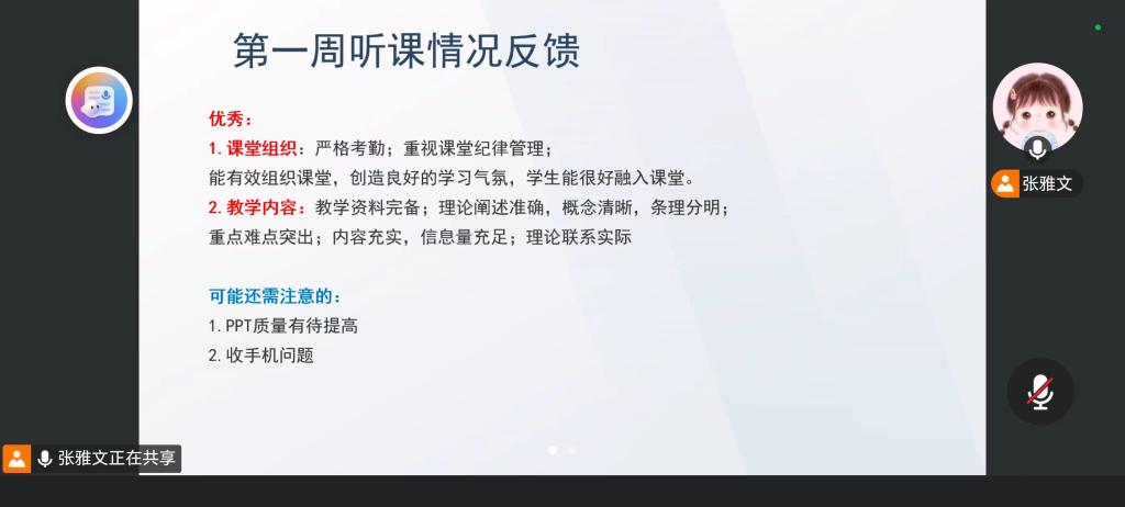 会议首先对第一周听课情况进行了反馈,肯定了课堂组织有序、教学内容完备等优点,同时也指出了PPT质量提升和课堂管理细节等改进空间。随后,会议重点讨论了教学资料的规范性问题,强调教纲、教案与授课进度表需严格对应,以确保教学工作的系统性和连贯性。