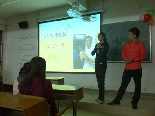 首先,在主持人薛宝源、温丽如介绍了各位嘉宾后,活动以精彩的PPT开篇。在神秘的氛围中,“真心话大冒险”游戏上场啦!中奖的同学都要到台上分享自己的真心话——最快乐的事,倘若不服从命令,则要接受大冒险游戏:从箱子里摸乒乓球(箱子里有”蛇“、蚯蚓、糖果、泥巴、玩偶……)。随着恐怖音乐的逐渐行进,大家高涨的情绪也丝毫未减。在一片欢呼雀跃中,第一环节就结束了。随即开始了第二个环节,请同学讲述自己不开心的事。大家立刻安静下来,认真回忆着自己的往事。片刻之后,大家踊跃发言,讲述自己的不快。接下来,就到了第三个环节:秀秀你的表演。大家欣赏了陈俊宇同学的深情演唱《光辉岁月》。