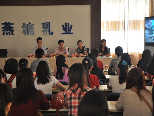 广东省农垦集团公司直属团委书记蓝华明、燕塘乳业股份有限公司团总支书记胡代锚、燕塘投资公司团总支书记温伟金代表企业方热情接待了我系参观团,并向我系参观者详细地介绍了他们企业的发展状态以及基本营运流程。为了让学子们更加详细了解燕塘牛奶的生产流程,三位书记带领大家参观了燕塘牛奶的罐装车间。这是许多学子第一次近距离接触到牛奶生产线。在参观时,蓝书记多次向同学们提及燕塘牛奶的质量安全性问题。他说,燕塘牛奶是严格按照国家标准来生产的,他们有专门的检测中心,能让安全性得到更大的保障,是让人放心的品牌。