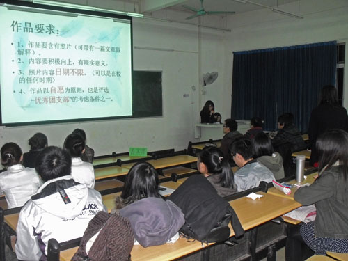 各班以自愿为原则,以文稿和相片结合的方式,将各班的班会或集体活动实况记录并通过财经系网络的平台来展现各班的风采。文稿由各班的通讯员统一整理可上交到网络编辑部或直接发送至 Sucjxthxy@126.com。