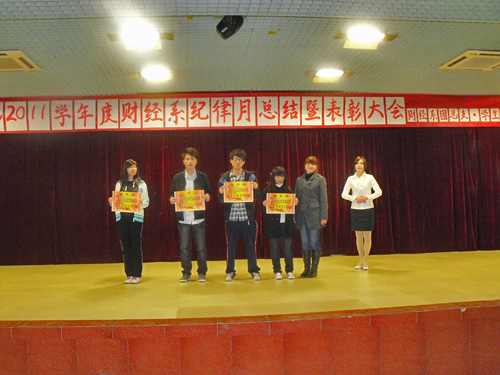 2011年3月10月晚7:30分,财经系2010-2011学年度纪律月总结暨表彰大会在六栋学术报告大厅隆重举行,员工处副处长袁颂皎,院团委老师邱尖锐,系党总支书记杨晓文、系办公室主任刘亮及全体辅导员等出席了本次大会。