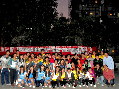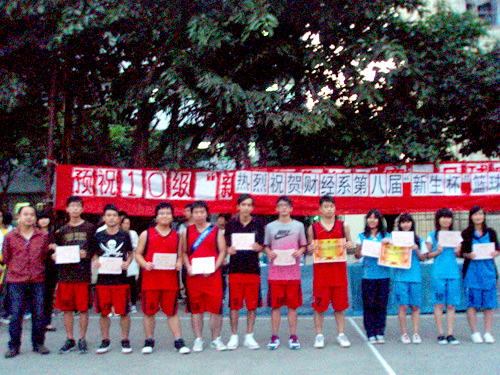 2010年11月16日下午4:30,财经系10级“新生杯”篮球赛闭幕式在灯光篮球场举行。财经系办公室主任刘亮主任,系团总支书记段妍君以及辅导员何世福等出席了此次比赛。最后一场是本经济与本财管对决,在赛上,各队员之间配合默契,裁判员判断精准,赛场上气氛活跃,充分显示了同学们的团结精神,也展现了同学们的良好精神风貌和高超的技术水平,最终由本经济摘得桂冠。