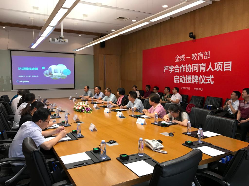 (通讯员 张建龙)5月18日,“教育部—金蝶产学合作研讨会暨产学合作协同育人项目启动授牌仪式”在深圳金蝶产业园隆重召开,来自省内二十余家高校代表齐聚一堂,共同围绕“开放合作、求真务实、协同育人”主题,对教育部产学合作协同育人项目进行了深入交流与经验分享,并对2017年与金蝶合作获得教育部立项项目的高校举办了隆重的授牌仪式。公司副经理张志红、陈天勇应邀参加了授牌仪式,并听取了大会报告,参加了围绕产学合作、协同育人项目展开的经验交流与分享。
