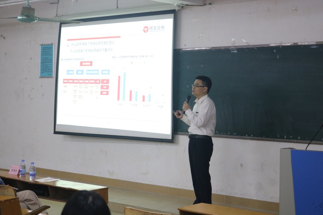 (通讯员 张建龙)11月13日晚,第七届“民生证券杯”系列讲座二——证券投资技巧专题讲座在7-318教室开讲,讲座由民生证券广州营业部投资顾问赵栩龙主讲。