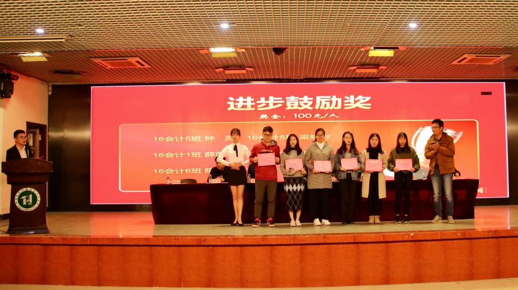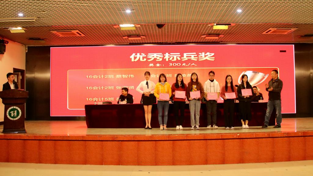 张志红副经理宣读关于2019年财会专业优秀实习生的表彰决定。简雅思等6名同学获得突出标兵奖,蔡智伟等6名同学获得优秀标兵奖,张智成等6名同学获得得力助手奖,梁晓彬等6名同学获得进步鼓励奖,共24名实习生获奖,发放奖金达7200元。郭琪经理、张岚经理、杨洪亮经理、邢风云经理上台为获奖员工颁奖。颁奖现场,同学们为获奖同学喝彩,掌声不断。