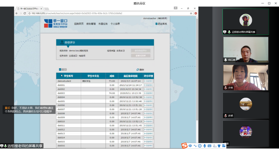 第二场培训由上海远恒公司楼老师主讲,主要对“单一窗口实务实习平台”的教师端任务布置、教务管理等平台功能进行了讲解和演示操作。参加此项培训的老师有担任《国际贸易实务》、《国际结算》等国际经济与贸易专业课程教学的陈少英、佟哲、吴霜、许旭、孙春露等老师。
