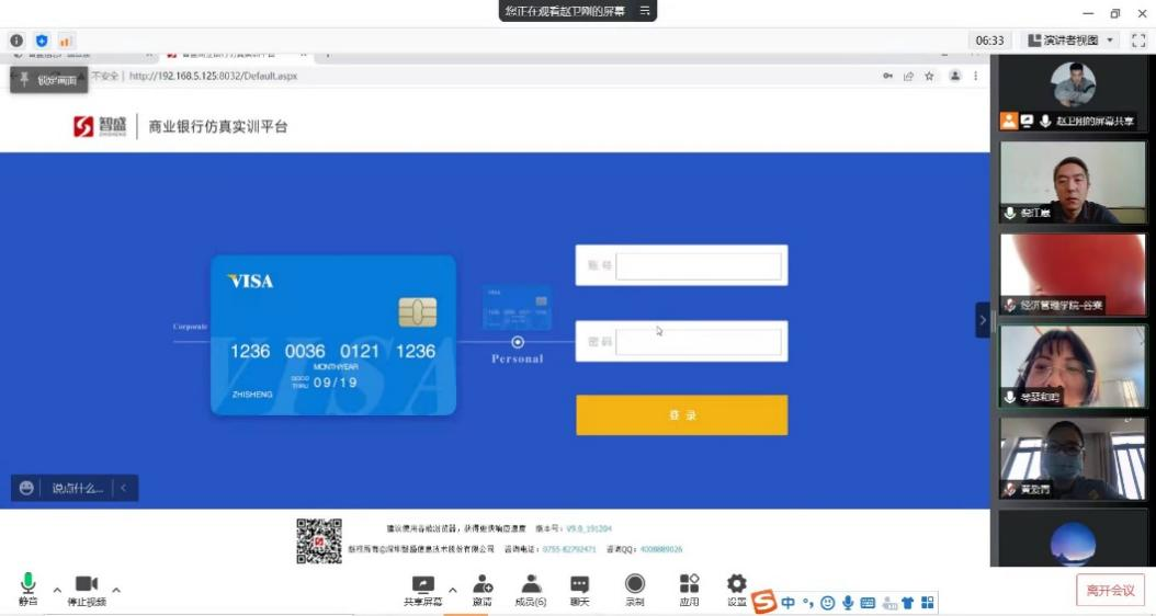 两场培训均采用线上“腾讯会议”的形式开展,第一场培训由深圳智盛公司技术工程师赵卫刚主讲,主要对“智盛商业银行岗位技能实习平台”系统平台的教师端设置功能、开设班级、布置实训任务等功能进行了操作演示。参加此项培训的老师有担任《商业银行经营管理》课程教学的谷雯、吴丽琴老师及担任《金融企业会计》课程教学的董长华、荣红涛以及经济系主任黄爱青。