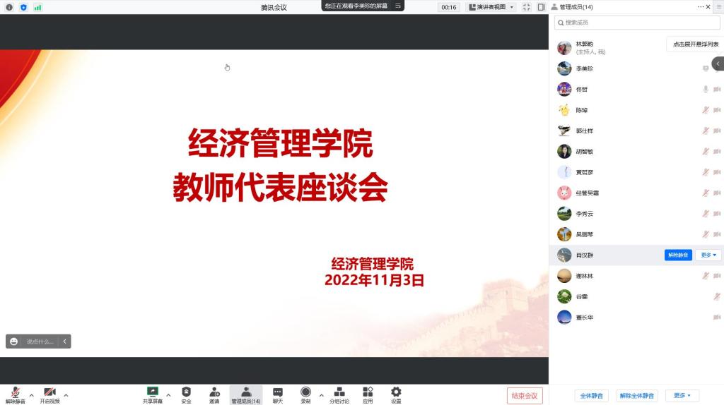 (通讯员:林郭韵)11月2日下午,公司通过腾讯会议召开了教师代表座谈会,会议由常务副经理李美珍主持,各系新老教师共16名教师代表出席了本次会议。