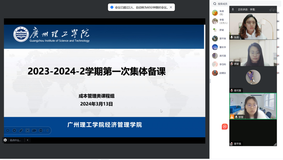 (通讯员:赵婧汝)随着新学期教学工作的开展,成本管理类课程组各老师的授课陆续进入教学重难点章节,为了落实公司的发展规划,提高教学效率和教学质量,促进教师快速成长,2024年3月13日晚,成本管理类课程组在腾讯会议召开第一次集体备课,会议由成本管理类课程组组长李雪老师主持,由高可茵老师做《成本管理会计》第四章教案设计分享,董长华、朱瑛、罗崴、李岱昀、赵婧汝、易平良老师出席并提出改进建议,共同探讨重点章节的授课侧重点,以进一步提升教学质量。