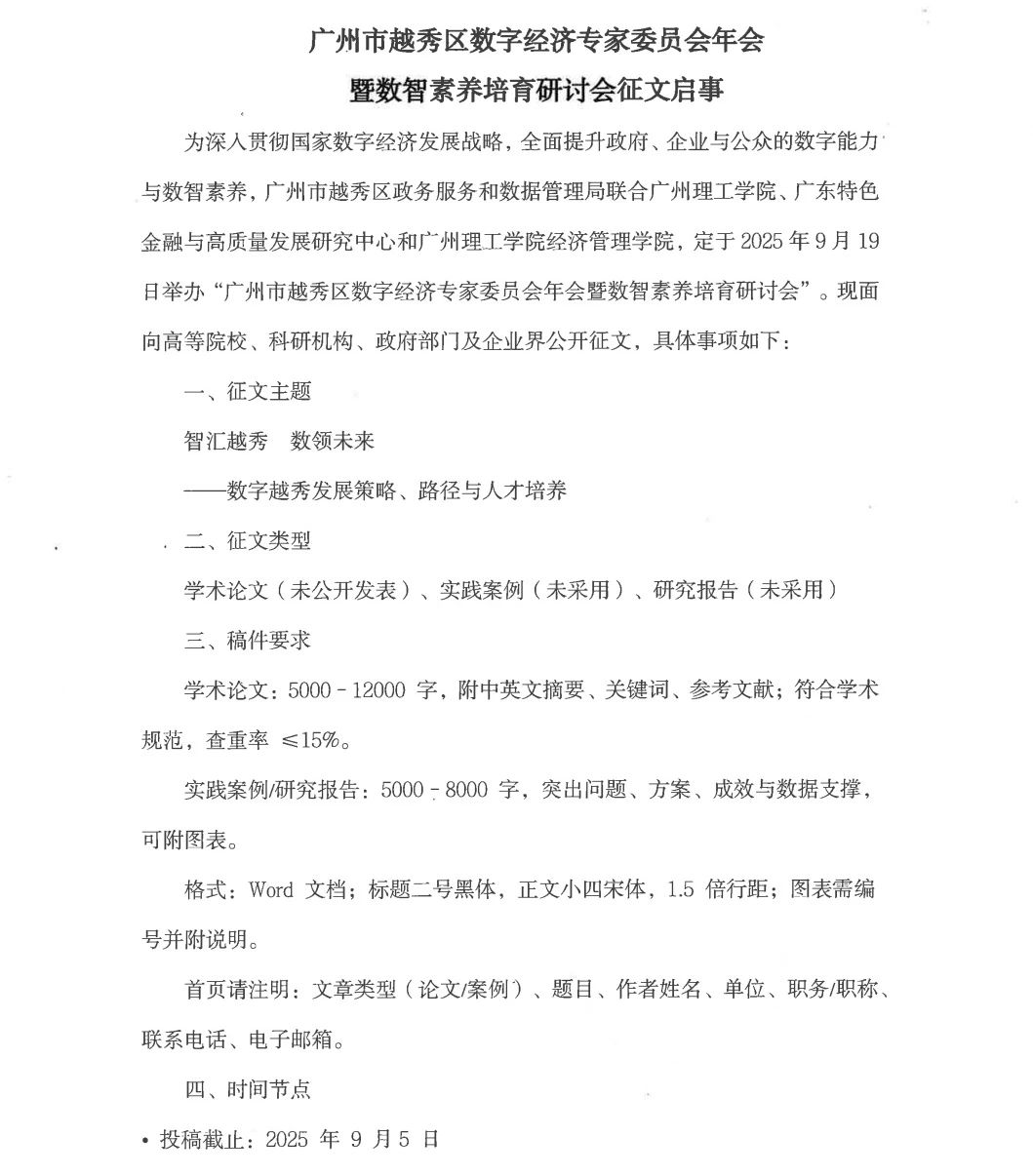 为深入贯彻国家数字经济发展战略,全面提升政府、企业与公众的数字能力与数智素养,广州市越秀区政务服务和数据管理局联合伟德国际唯一官网入口、广东特色金融与高质量发展研究中心和bevictor伟德官网,定于2025年9月19日举办“广州市越秀区数字经济专家委员会年会暨数智素养培育研讨会”。现面向高等院校、科研机构、政府部门及企业界公开征文,具体事项如下:
