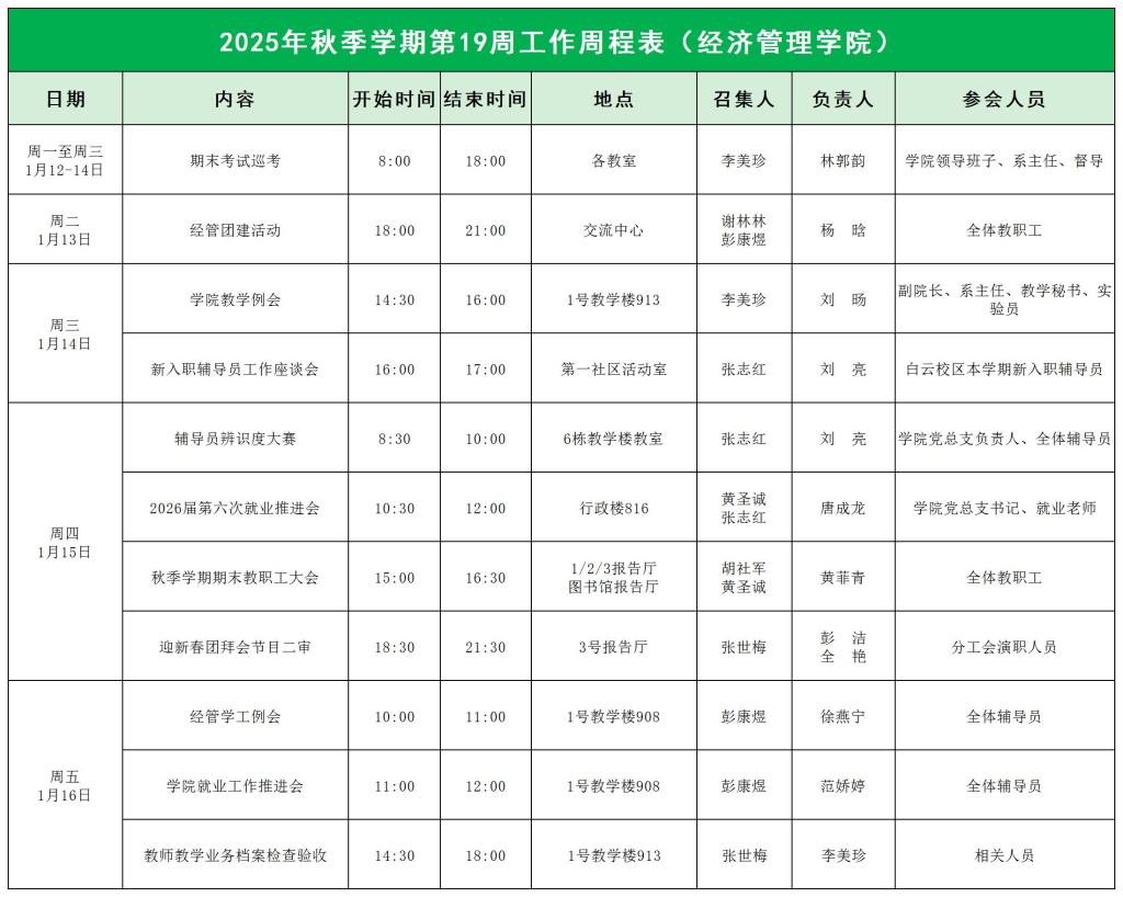 2025年秋季学期第19周工作周程表