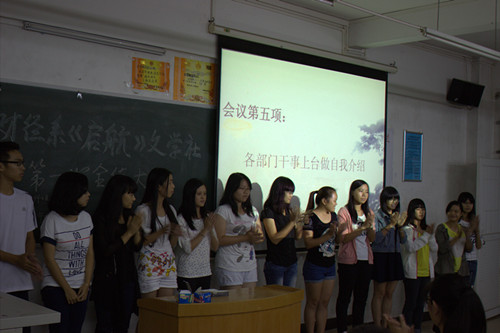 随后,紧接着大二干部陈欢宣读了新一届干事的名单,大一干事轮流上台进行自我介绍,每个干事都表示很高兴能加入财经系“启航文学社”这个大家庭。无规矩不成方圆,编委办公室主任李镇皓宣读了内部规章制度,希望大家严格遵守。