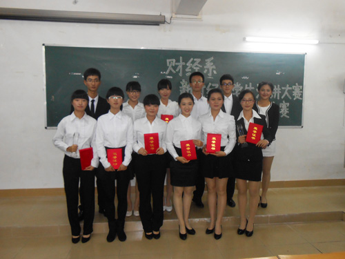 本次比赛,来自本财管132班的陈哲选手以其稳健的台风和大方的谈吐一举摘得冠军、本经济132班的陈鋆选手荣获亚军、本会计132班的陈锶婷选手荣获季军,选手吴咏仪、郑碧晴、李明、徐润莹、丘珊珊、高雅获得优秀奖,选手王乔获得最佳台风奖,比赛取得圆满成功。