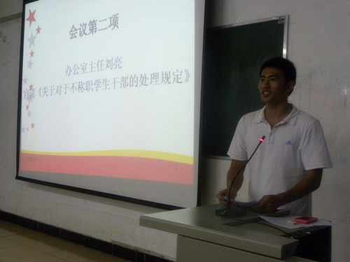 大会首先由刘亮主任宣读有关不称职干部的处理规定,希望各员工干部能够以身作则,严格要求自己,带动身边更多的同学参与到评建工作中,若发现员工干部或班上的同学出现违规行为将作严肃处理,希望员工干部能够配合辅导员做好管理工作。接着,李伟民书记作重要讲话,他希望在公司评估期间,全系师生能加强对自身的管理,严格要求自己,避免迟到,旷课,宿舍,教室卫生等违纪现象的出现,期望在全体师生的努力下,我系能够顺利通过教学工作状态评估。最后员工干部代表丘立平同学发言,号召大家做好本职工作,为公司迎评促建做出应有的贡献。