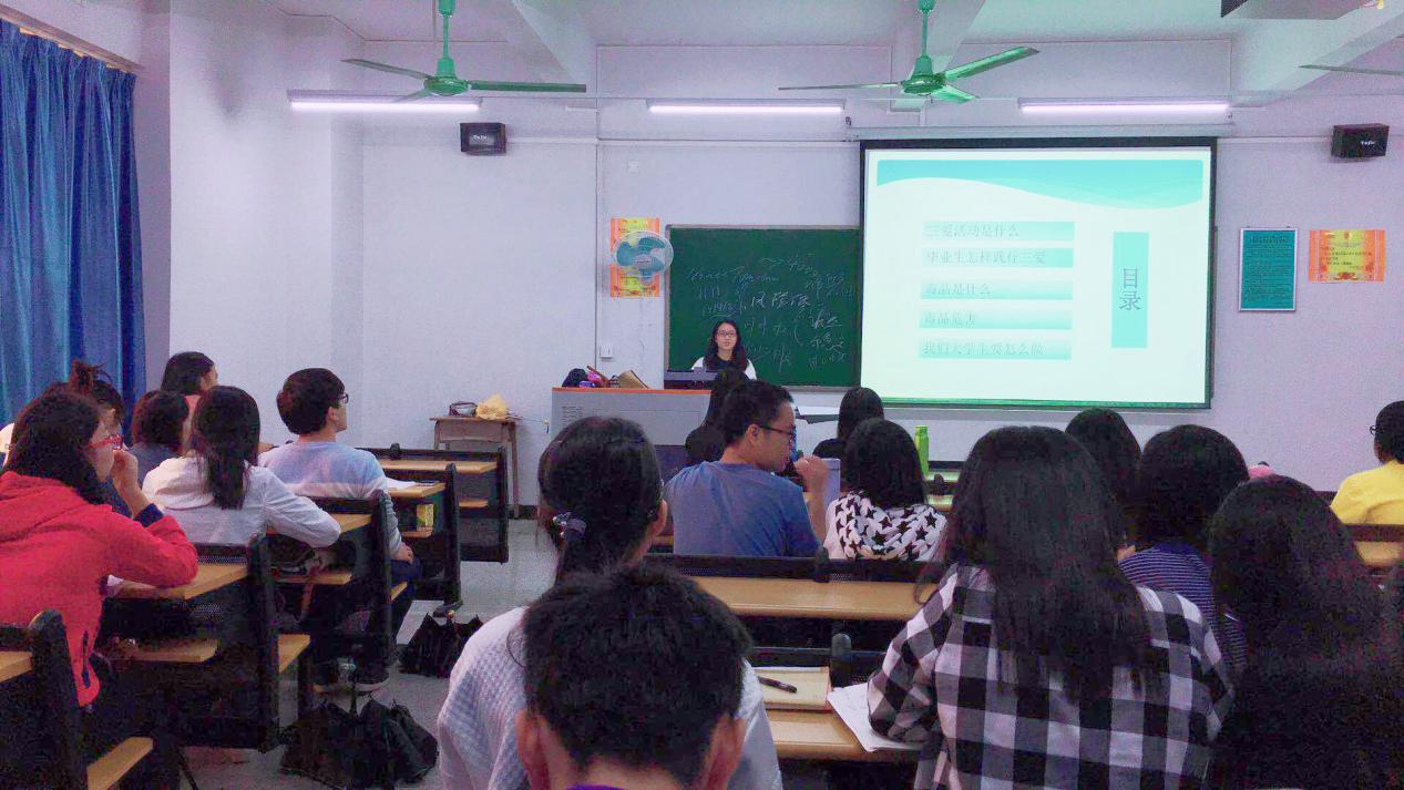 班会由团支书庞晓兰主持,班会主要围绕三爱活动是基本含义,毕业生如何践行三爱;毒品的含义,毒品的危害,以及老员工要如何防范毒品这几方面开展。