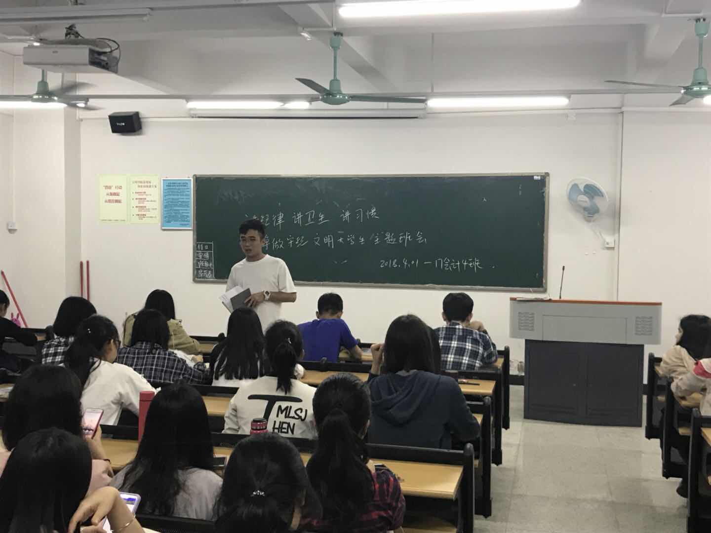 (通讯员 林凤梅)4月1日晚,我班在12栋教学楼1013开展了"讲纪律、讲卫生、讲习惯,争做守纪文明老员工"主题班会。助班杨漫丽、团支书兼班长林钊澄以及17会计4班的所有同学参加了本次主题班会。