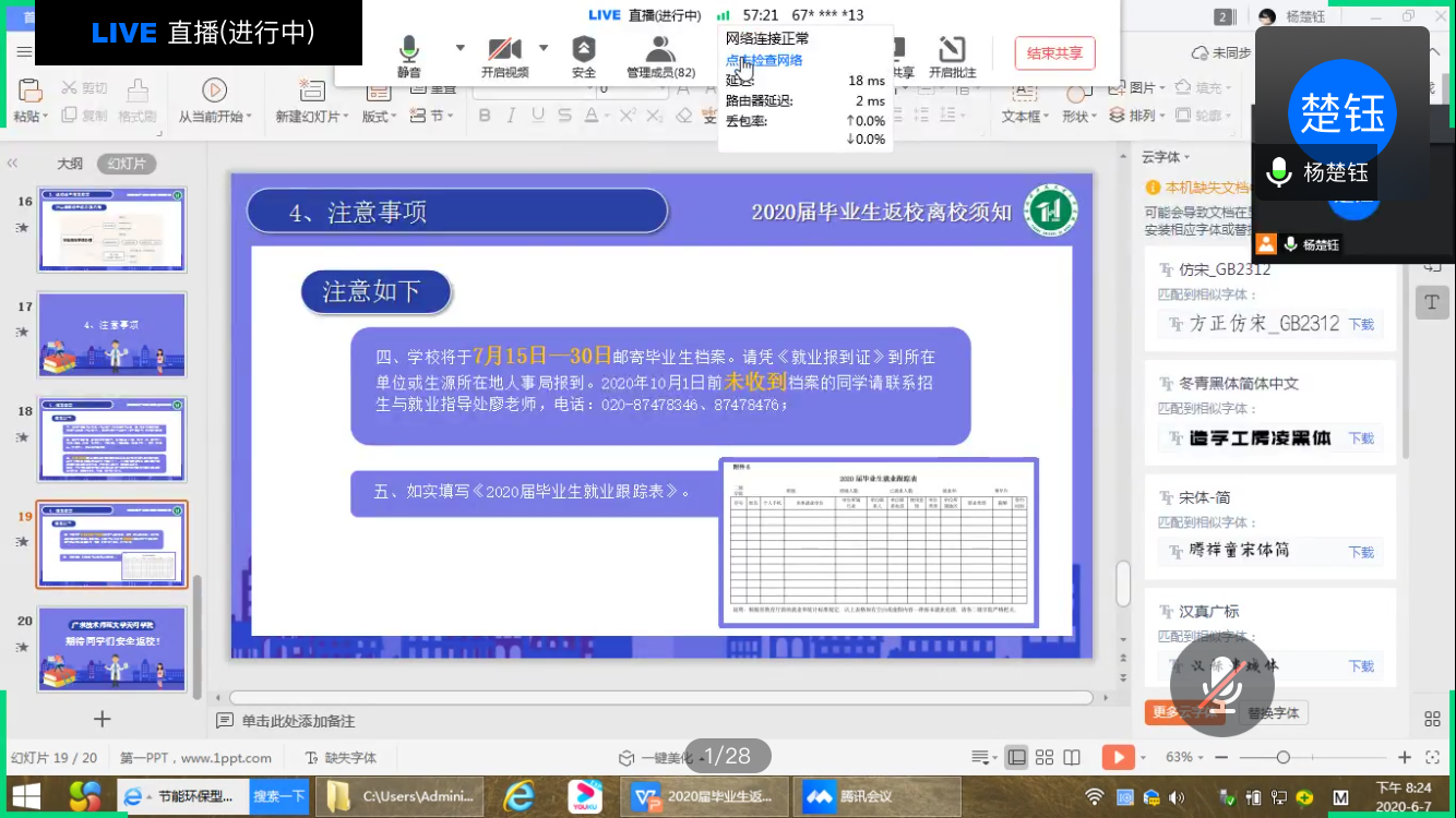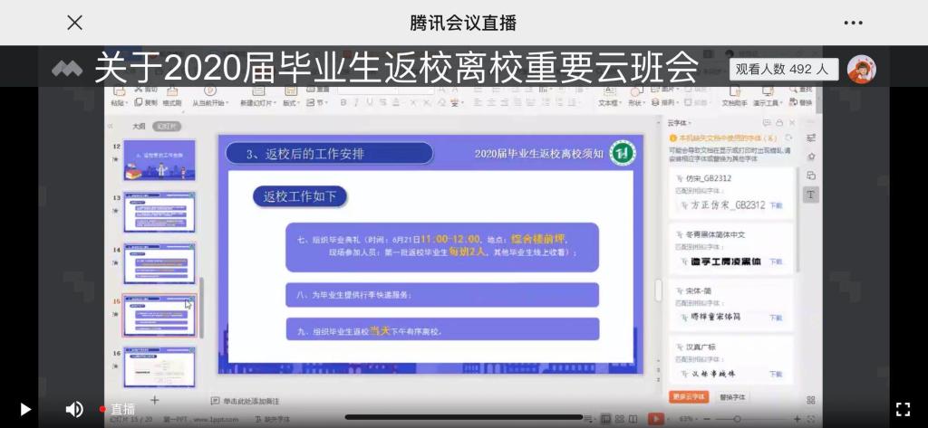 (通讯员:谭智和、钟月月)为全面贯彻落实公司关于2020届毕业生返校离校工作方案,切实做好毕业生返校离校相关具体工作,公司于6月7日晚召开2020届毕业生返校离校主题云班会。会议由辅导员谭智和、杨楚钰、钟月月分别主持,全体毕业班同学参加。