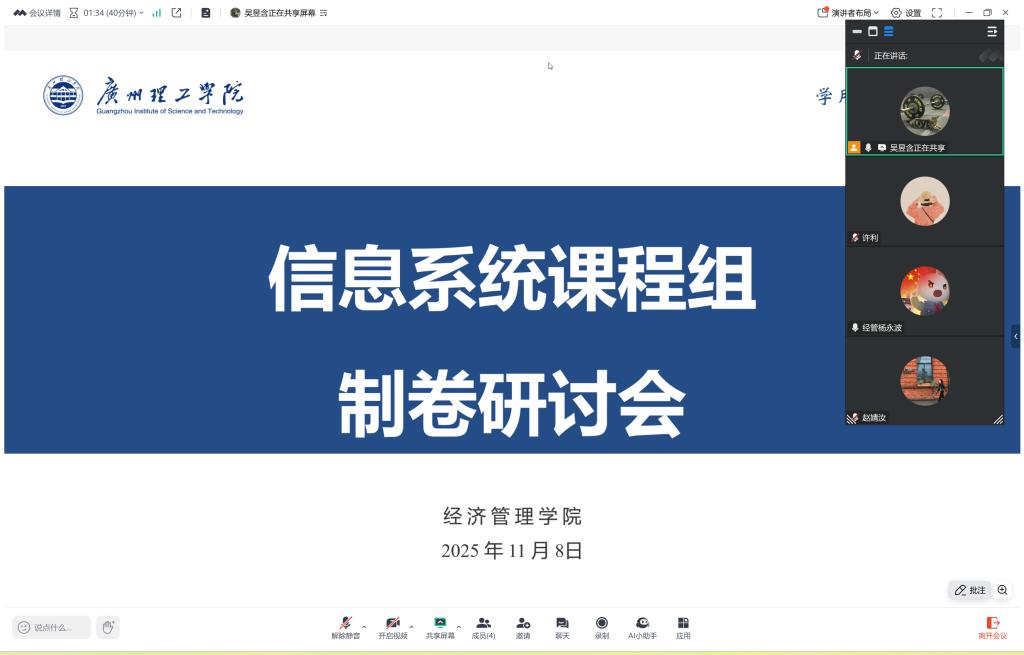 (通讯员:吴昱含)为贯彻落实公司与公司关于期末命题工作的规范要求,确保期末考试命题的科学性、规范性与安全性,信息系统课程组于2025年11月8日晚在腾讯会议组织召开制卷专题研讨会。会议由课程组组长吴昱含主持,人工智能概论与GPT应用课程任课教师杨永波老师、计算机财务管理课程任课教师许利老师及原任课教师赵婧汝老师共同参会。