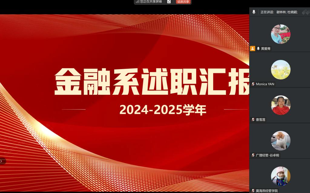 为全面总结2024-2025学年师德建设、教学、科研及学科竞赛指导等工作成效,客观评价教师履职表现,根据公司和公司年度考核工作统一部署,金融系评议小组于2025年11月14日下午通过线上会议成功召开了2024-2025学年年度述职大会。评议小组成员包括原金融系主任黄爱青、经理谢林林、常务副经理李美珍,负责对述职情况进行综合评议,金融系共有29位教师参与述职。