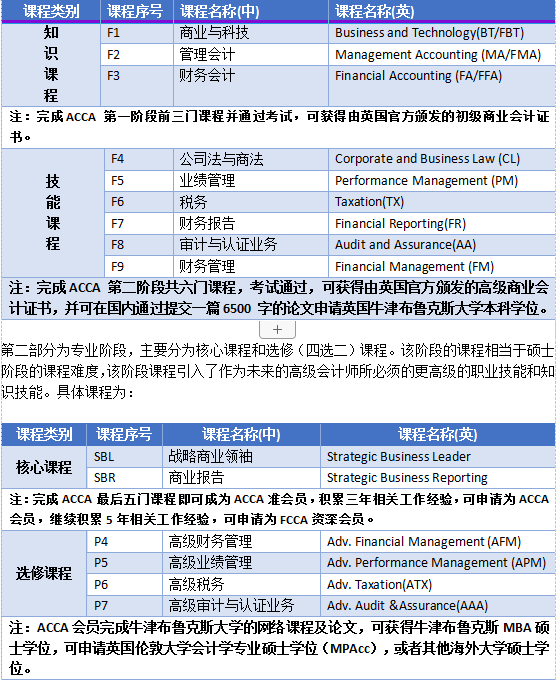 大纲共15门课程,需要通过13门考试,课程分为两个部分,3个阶段,通过考试可获得3份不同等级的资格证书及英国牛津布鲁克斯大学学位。公司ACCA精英班主要开设F1-F9课程。