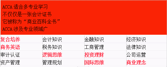 由于其课程内容全面、完善、综合性强,因此被誉为“财会专业的MBA课程”。随着许多职业就业标准走向国际化,ACCA资格更被认为是“国际财会界的通行证”。