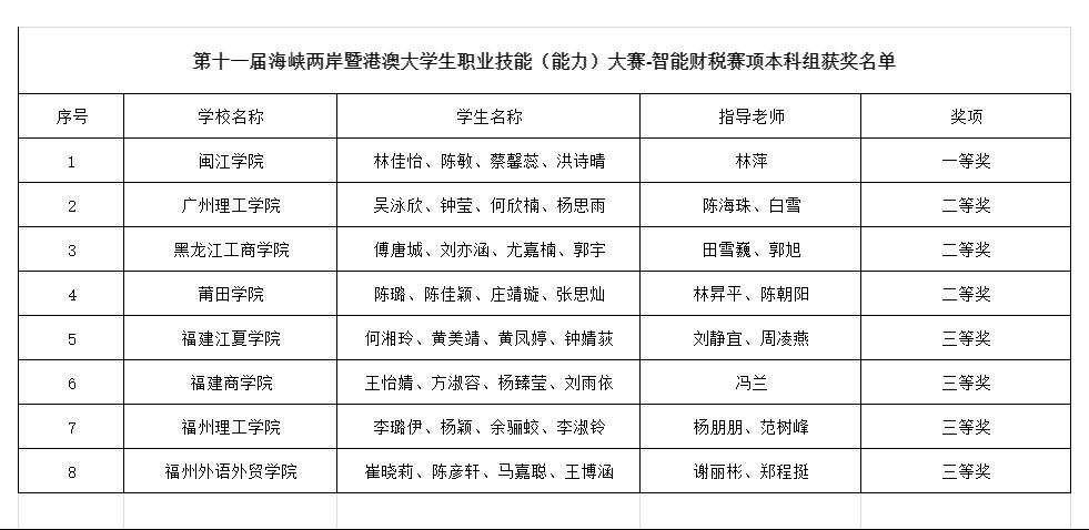 (通讯员:陈海珠)2024年10月27日,由福建省教育厅、福建省人力资源和社会保障厅、福建省互联网信息办公室和平潭综合实验区管委会主办福建商公司承、中联集团教育科技有限公司协办的“2024年第十一届海峡两岸暨港澳老员工职业技能(能力)大赛-智能财税赛项"的总决赛在云端成功举办。公司学子吴泳欣、钟莹、何欣楠、杨思雨组成的参赛团队,在陈海珠老师和白雪主任的指导下,荣获全国二等奖的优异成绩,展现了公司学子扎实的专业基础和实践能力。