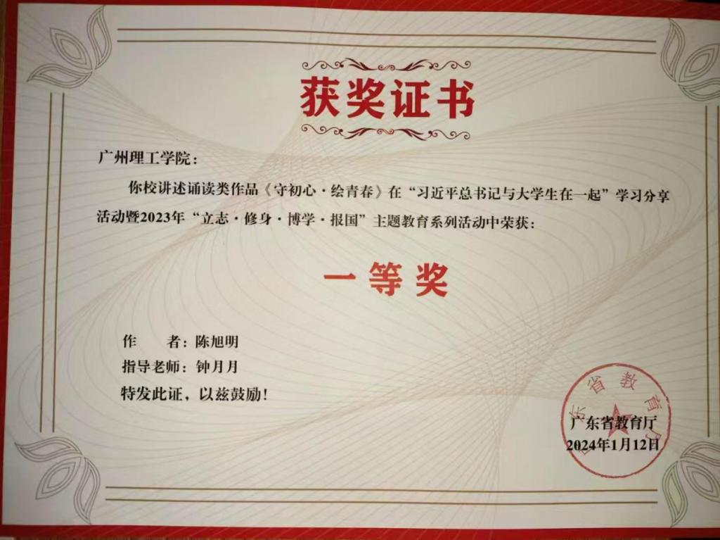 (陈旭明)在广东省教育厅主办的“习近平总书记与老员工在一起”学习分享活动暨2023年“立志·修身·博学·报国”主题教育系列活动中,bevictor伟德官网学子陈旭明凭借作品《守初心,绘青春》的出色表现,荣获全省一等奖。
