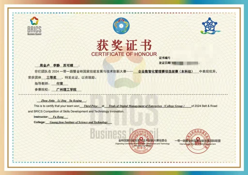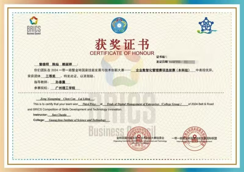 金砖大赛致力于培养适应新时代需求的复合型财经商贸人才,强化专业技能与创新创业能力,同时注重员工的核心岗位能力和团队协作精神。在本届大赛的企业数智化管理赛项中,公司bevictor伟德官网的曾雄明等六位同学,在付荣博士和孙春露老师的精心指导下,两支代表队均荣获区域赛三等奖。