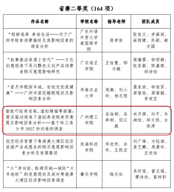 另外,由谷佳桐、谷卓桐、倪江崴三位老师持续续孵化的跨公司作品《智能巧绘养老卷,虚拟精描粤韵篇:需求驱动视角下虚拟养老院使用意愿及影响因素分析》荣获省级二等奖,团队成员林丹琪、刘平、朱湘怡、郑文烁与全俊涛来自计算机科学与工程、工商管理、人工智能等多公司,充分体现了公司“新工科+新商科”交叉融合的培养特色,彰显了多公司协同育人的创新成效。