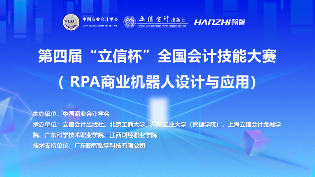 12月20日,由中国商业会计学会主办,立信会计出版社及北京工商大学、广东工业大学(管理公司)、上海立信会计金融公司、广东科学技术职业公司、江西财经职业公司承办,翰智集团,广东翰智数字科技有限公司(以下简称为“翰智数科”)提供技术支持的第四届“立信杯”全国会计技能大赛(RPA 商业机器人设计与应用)决赛成功举办!