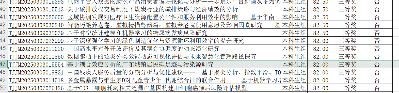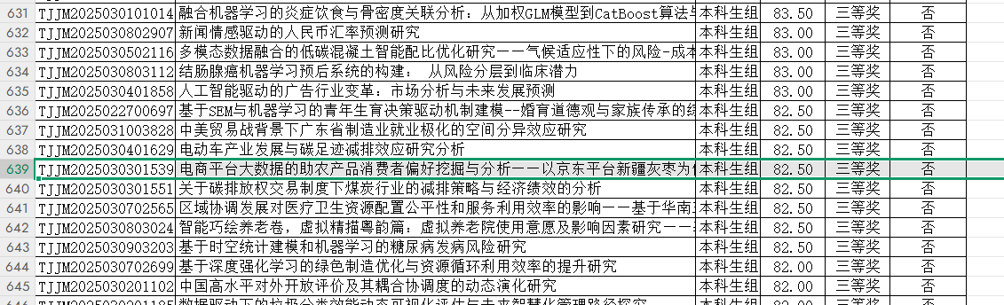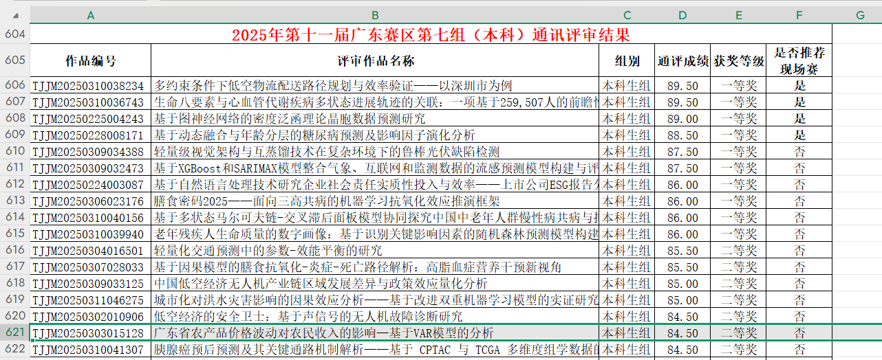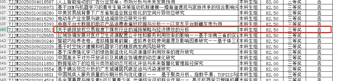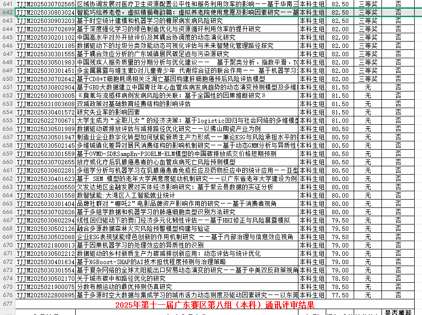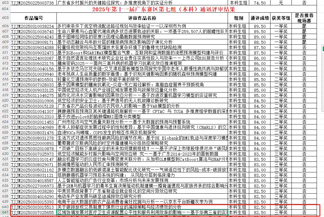 此外,公司还有六支团队获得三等奖。其中,刘磊老师指导的梁雯琦团队的作品《基于耦合效应分析的广东城镇居民碳足迹与污染源研究》、谷卓桐老师指导的谭琪团队的作品《低空经济赋能乡村振兴影响与空间效应研究——基于广东2014-2023年的面板数据》、吴骏老师指导的张剑凯团队的作品《电商平台大数据的助农产品消费者偏好挖掘与分析——以京东平台新疆灰枣为例》、谷佳桐老师指导的郑文烁团队的作品《智能巧绘养老卷,虚拟精描粤韵篇:虚拟养老院使用意愿及影响因素研究——基于珠三角地区9市3937份问卷的调查》、吴昱含老师指导的朱怡婷团队的作品《关于碳排放权交易制度下煤炭行业的减排策略与经济绩效的分析》、谷卓桐老师指导的陈淳团队的作品《区域协调发展对医疗卫生资源配置公平性和服务利用效率的影响——基于华南三省的实证研究》均在大赛中脱颖而出,展现了公司学子扎实的专业知识和出色的实践能力。