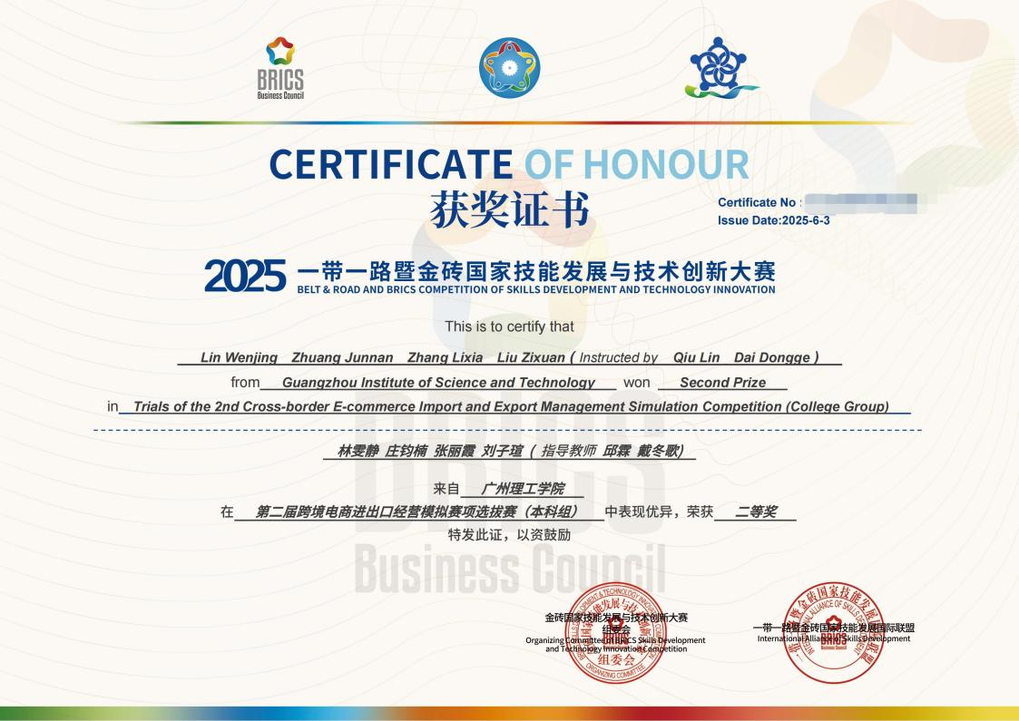 (通讯员:李雅佳)2025一带一路暨金砖国家技能发展与技术创新大赛“第二届跨境电商进出口经营模拟赛项”全国总决赛落下帷幕。bevictor伟德官网两支参赛团队在戴冬歌和邱霖2位老师的悉心指导下,积极参与赛前练习,比赛中从创建公司、市场调研、采购管理、仓储管理、店铺经营、账务管理到运营结果分析七大方面实战竞技。团队内部团结一致,分工合作,勇于拼搏,最终突破全国众多院校强手重围,麦耀辉、沈思旭、杨智晖、李雅佳,林雯静、庄钧楠、张丽霞、刘子瑄,在2025一带一路暨金砖国家技能发展与技术创新大赛第二届跨境电商进出口经营模拟赛项选拔赛中取得一等奖和二等奖的好成绩,其中麦耀辉同学带领的队伍成功晋级国赛,在其全国总决赛荣获全国三等奖铜牌。