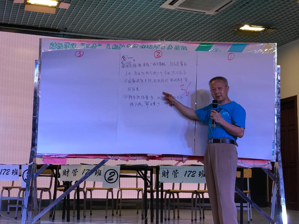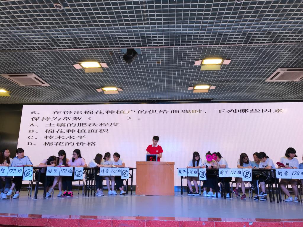 经过初赛激烈角逐,17经济2班、17财管1班、17财管2班、17财管3班、17国贸2班、17国贸3班共六支参赛队伍晋级决赛。本次决赛共分为必答环节、计算题环节、抢答环节和案例分析环节四个环节。决赛第一环节是必答环节,要求选手们在规定时间内迅速作答。紧接着便是计算环节与抢答环节,抢答环节紧张激烈的比拼将比赛推向了高潮。经过前三轮激烈角逐,17财管1班、17财管3班、17国贸2班、17国贸3班四支队伍脱颖而出,进入第四环节—案例分析题,选手们将答案写到答题板,并对解题思路进行现场讲述,再由评委老师进行点评给出成绩。现场,参赛同学精神饱满,默契配合,每支参赛队伍都尽情发挥,各施所长。竞赛过程中杨润生教授和许旭老师上台,对选手们的答题情况进行了精彩详细的分析和点评。互动环节听歌猜歌名倍受欢迎。比赛中还邀请了公司文艺队进行吉他弹唱表演,使竞赛过程更加丰富多彩。