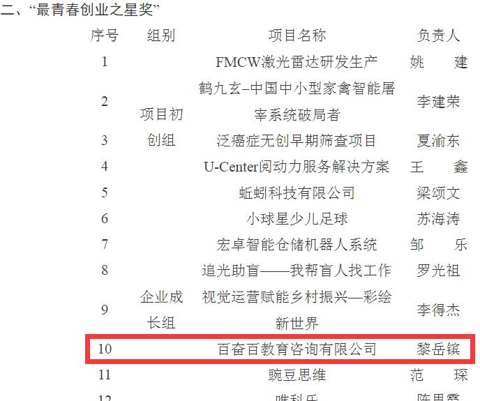 (通讯员 陈天勇)日前,通过专家评委打分、网络投票,“青创杯”第七届广州青年创新创业大赛获奖名单出炉啦!公司员工项目“百奋百教育咨询有限公司”荣获“最青春创业之星奖”。项目团队成员有:黎岳镔、黄慧瑛、谭斯琳、陈树洁、冯蔼琪、邹小莉、林小惠、程秀文。