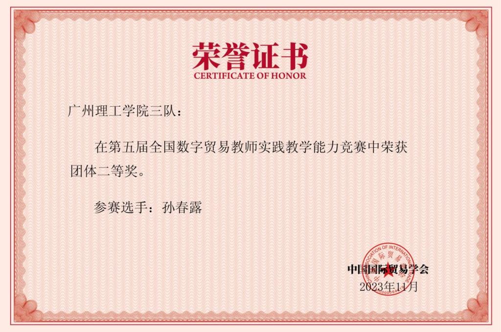 (通讯员:孙春露)中国国际贸易学会举办的第五届全国数字贸易教师实践教学能力竞赛已于2023年11月26日成功落幕。全国数字贸易教师实践教学能力竞赛响应国家数字贸易战略,是提升教师在数字经济时代下的数字贸易业务实践教学能力,推动双师型团队队伍建设,构建数字贸易实践教学体系,强化实践育人,从而培养具有国际化视野和跨文化沟通能力、熟悉国内外规则和市场环境的数字贸易复合型技术技能人才。