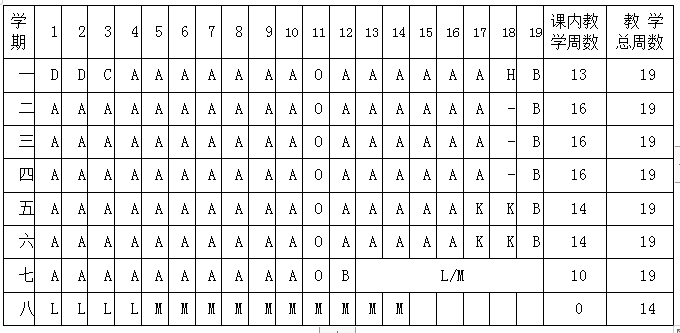 符号说明:A课堂教学 B考试 C入学教育 D军事训练 E社会调查与实践 F公益劳动G课程设计 H认识实习 I金工实习 J电工实习 K专业实习 L毕业实习M毕业设计(论文)N假期O三全育人周
