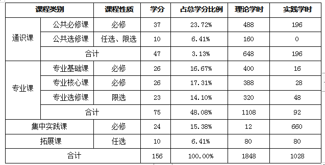 (一)课程体系结构及学时学分比例表