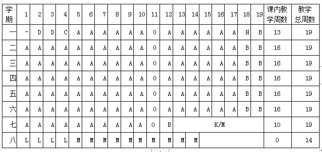 A课堂教学 B考试 C入学教育 D军事训练 E社会调查与实践 F公益劳动 G课程设计 H认识实习 I金工实习 J电工实习 K专业实习 L毕业实习 M毕业设计(论文) N假期